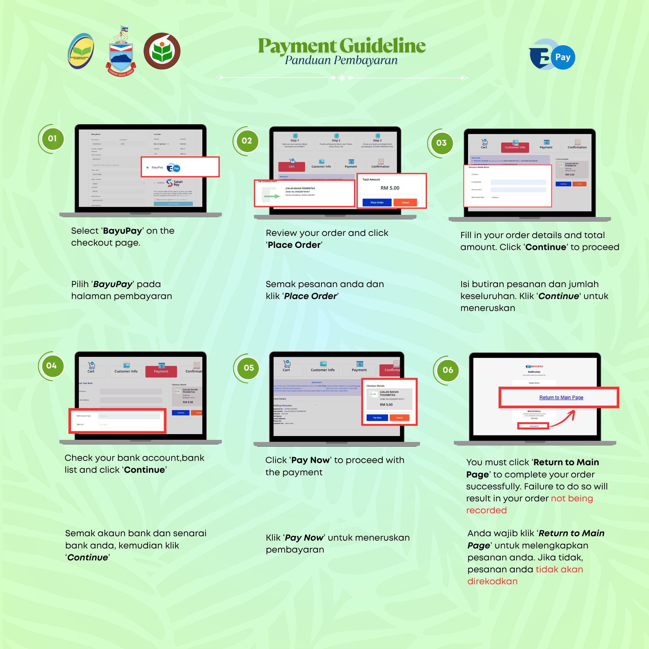 Sekiranya anda menghadapi sebarang masalah atau mempunyai pertanyaan mengenai pembayaran, sila hubungi kami di 088283290 (Seksyen Digital Pertanian) atau email ke doasabah@sabah.gov.my